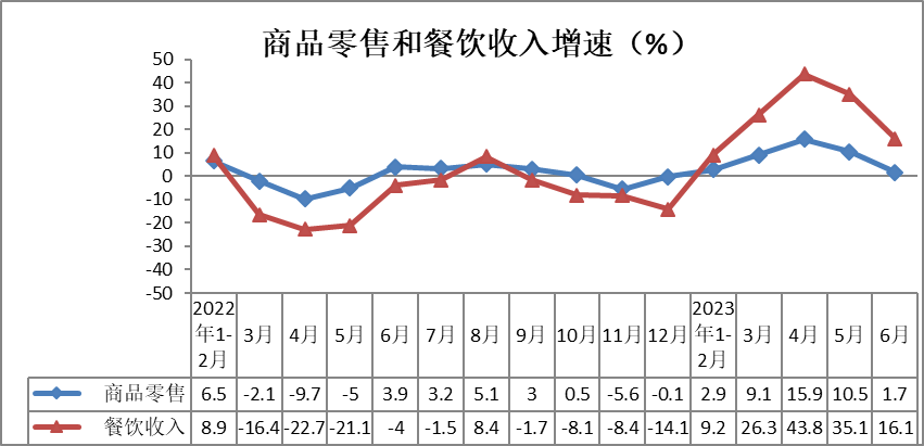 其中,6月份,商品零售实现35581亿元,同比增长1.7%,增速较5月份放缓8.8个百分点。餐饮收入实现4371亿元,同比增长16.1%,增速较5月份放缓19个百分点。