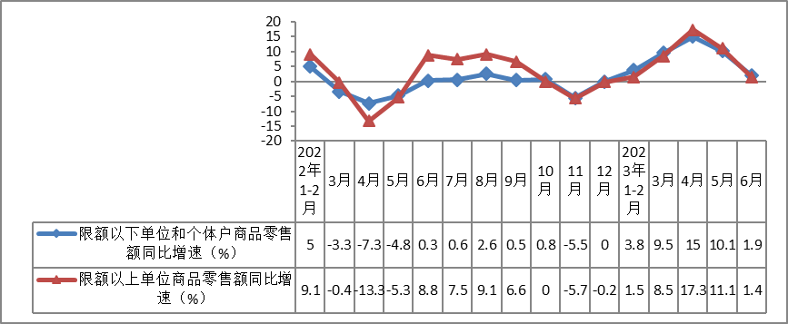 经测算,上半年,限额以下单位和个体户商品零售额实现124147亿元,同比增长7.1%,增速较一季度加快1.5个百分点。其中,6月份限额以下单位和个体户商品零售额同比增长1.9%,增速较5月份放缓8.2个百分点,快于限额以上单位商品零售增速0.5个百分点。