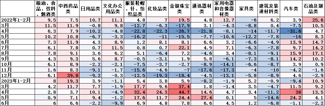 其中,6月份,限额以上单位粮油食品和饮料烟酒类、中西药品类、服装鞋帽和针纺织品类、化妆品类、金银珠宝类、通讯器材类、家用电器和音响器材类商品零售额同比分别增长6%、6.6%、6.9%、4.8%、7.8%、6.6%、4.5%,市场销售情况相对较好。