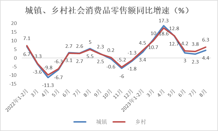 8月份,城镇消费品零售额实现32974亿元,同比增长4.4%,增速较7月份加快2.1个百分点;乡村消费品零售额实现4959亿元,同比增长6.3%,增速较7月份加快2.5个百分点,快于城镇1.9个百分点。