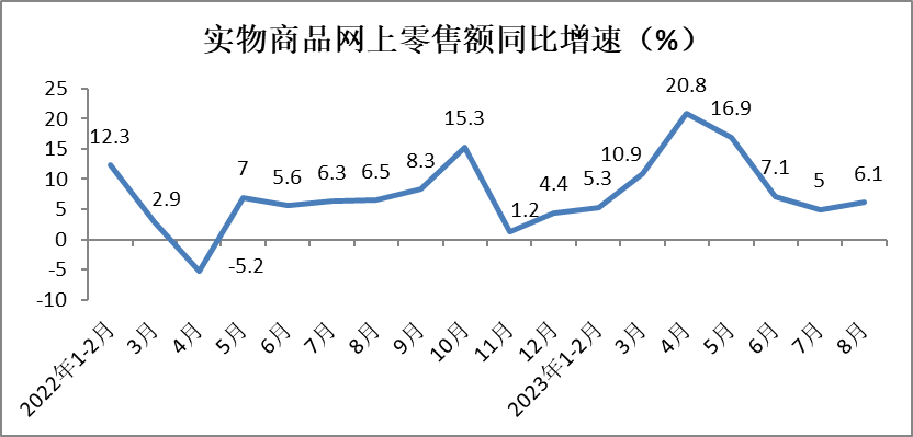 经测算,8月份,实物商品网上零售额实现9965亿元,同比增长6.1%,增速较7月份加快1.1个百分点。1-8月份,实物商品网上零售额实现79821亿元,同比增长9.5%,增速较1-7月份放缓0.5个百分点。1-8月份,实物商品网上零售额占社会消费品零售总额的比重为26.4%,占比与1-7月份持平。