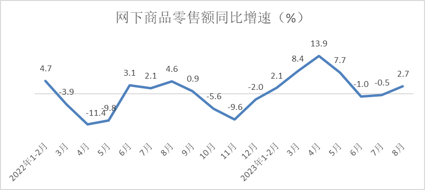 经测算,8月份网下商品零售额实现23756亿元,同比增长2.7%,增速较7月份加快3.2个百分点。1-8月份,网下商品零售额实现189642亿元,同比增长4%,增速较1-7月份放缓0.3个百分点。