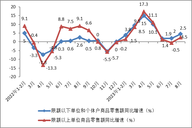 经测算,8月份限额以下单位和个体户商品零售额同比增长4.5%,增速较7月份加快2.5个百分点。1-8月份,限额以下单位和个体户商品零售额实现164609亿元,同比增长6%,增速较1-7月份放缓0.3个百分点。