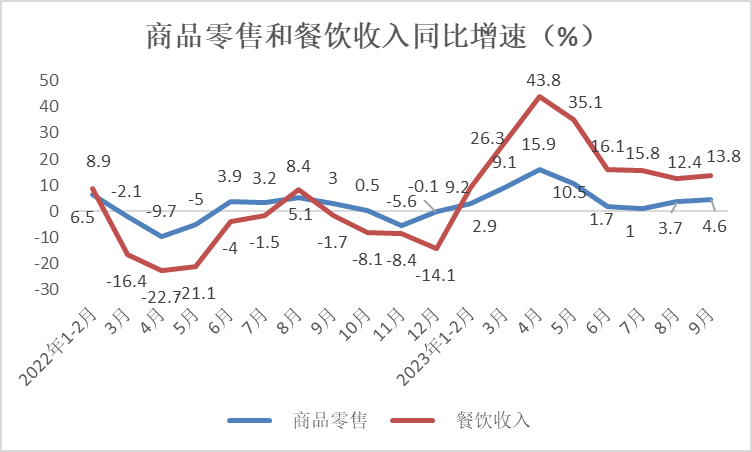 9月份,商品零售实现35539亿元,同比增长4.6%,增速较8月份加快0.9个百分点。餐饮收入实现4287亿元,同比增长13.8%,增速较8月份加快1.4个百分点。