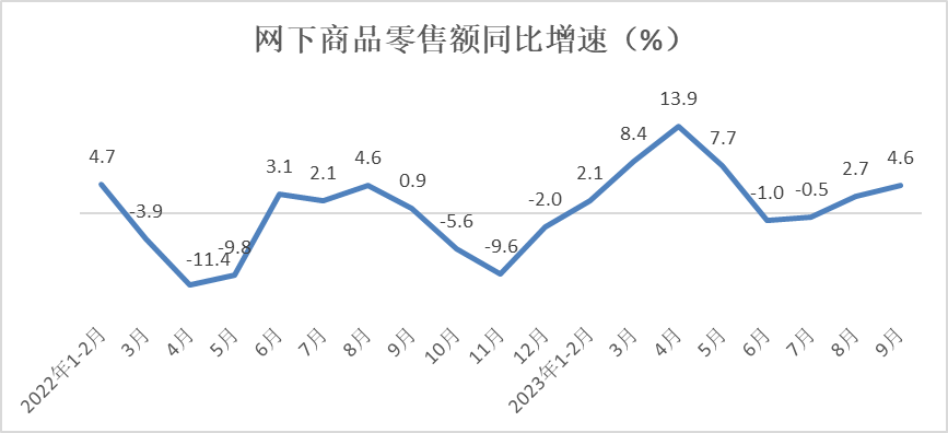 经测算,9月份网下商品零售额实现24925亿元,同比增长4.6%,增速较8月份加快1.9个百分点。前三季度,网下商品零售额实现214567亿元,同比增长4.1%,增速较1-8月份加快0.1个百分点。