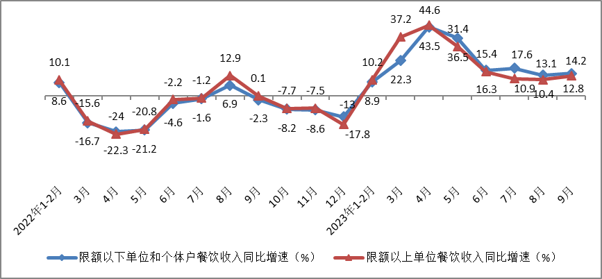 经测算,9月份限额以下单位和个体户餐饮收入同比增长14.2%,增速较8月份加快1.1个百分点。前三季度,限额以下单位和个体户餐饮收入实现27403亿元,同比增长18.6%,增速较1-8月份放缓0.7个百分点。
