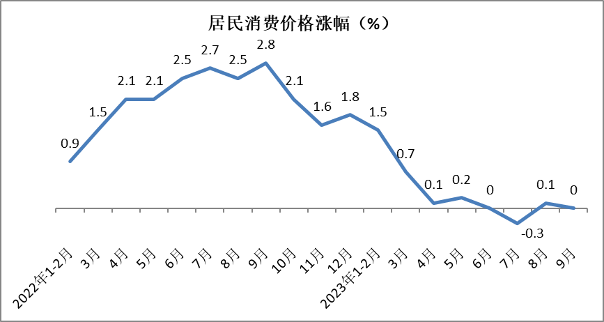 9月份,全国居民消费价格(CPI)同比持平,涨幅较8月份收窄0.1个百分点。其中,食品烟酒类价格同比下降1.5%,影响CPI(居民消费价格指数)下降约0.44个百分点;其他用品及服务、教育文化娱乐、医疗保健价格分别上涨3.9%、2.5%和1.3%,衣着、居住价格分别上涨1.1%和0.2%;交通通信、生活用品及服务价格分别下降1.3%和0.4%。前三季度,全国居民消费价格同比上涨0.4%,涨幅较1-8月份收窄0.1个百分点。