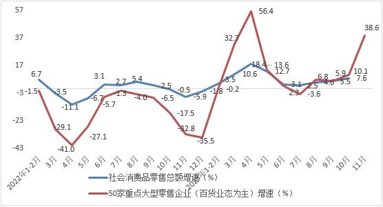根据乐鱼电竞的监测数据,2023年11月全国50家重点大型零售企业(以百货业态为主)零售额同比增长38.6%(上年同期增速为-32.8%)。