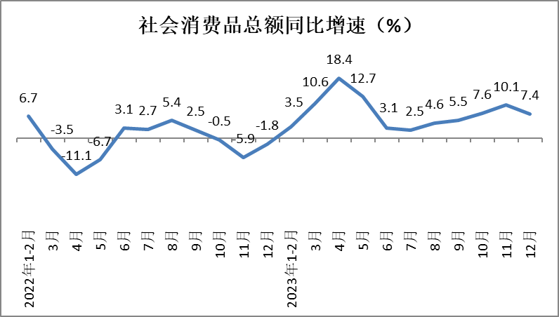 12月份,社会消费品零售总额实现43550亿元,同比增长7.4%,增速较11月份放缓2.7个百分点。除汽车以外的消费品零售额38131亿元,增长同比7.9%,增速较11月份放缓1.7个百分点。2023年,社会消费品零售总额471495亿元,同比增长7.2%,增速与前11月基本持平。