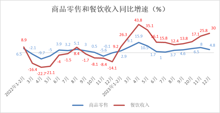 12月份,商品零售实现38145亿元,同比增长4.8%,增速较11月份放缓3.2个百分点。餐饮收入实现5405亿元,同比增长30%,增速较11月份加快4.2个百分点。