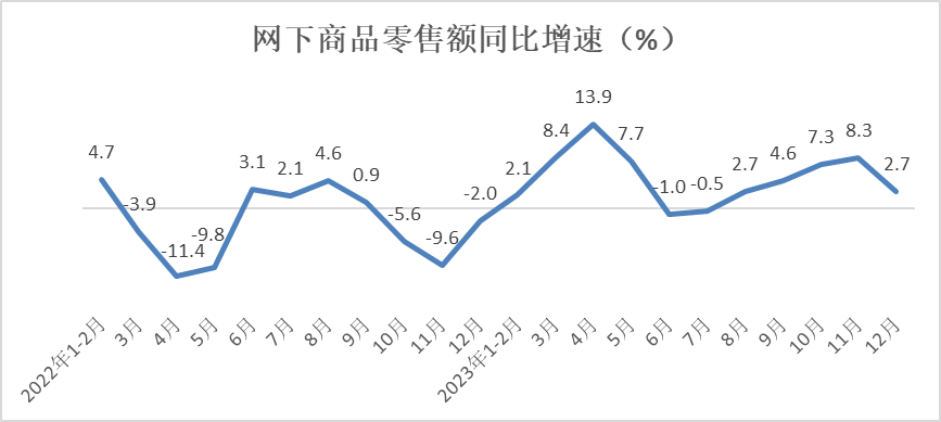 经测算,12月份网下商品零售额实现25680亿元,同比增长2.7%,增速较11月份放缓5.6个百分点。2023年,网下商品零售额实现288431亿元,同比增长4.7%,增速较前11月放缓0.2个百分点。
