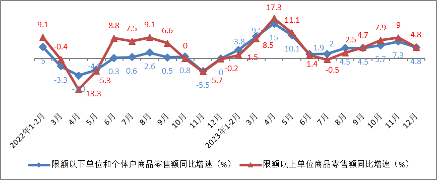 经测算,12月份限额以下单位和个体户商品零售额同比增长4.8%,增速较11月份放缓2.5个百分点。限额以上单位商品零售额同比增长4.8%,增速较11月份放缓4.2个百分点。
