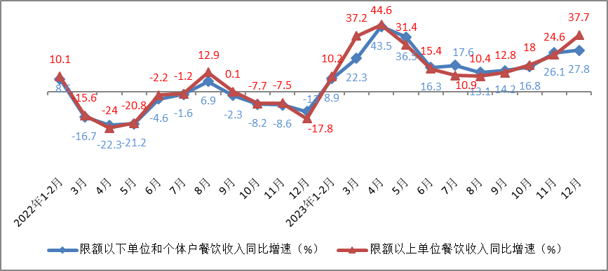 经测算,12月份限额以下单位和个体户餐饮收入同比增长27.8%,增速较11月份加快1.7个百分点。限额以上单位餐饮收入同比增长37.7%,增速较11月份加快13.1个百分点。
