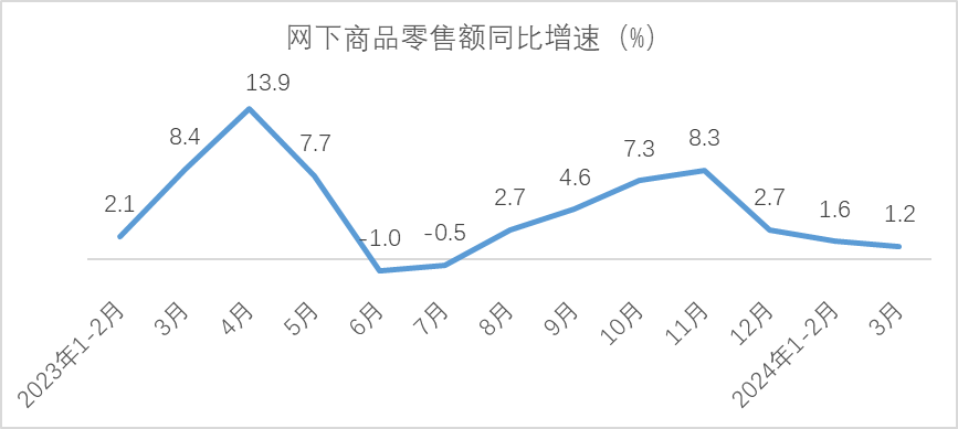根据测算,3月份网下商品零售额同比增长1.2%,增速较1-2月份累计增速放缓0.4个百分点。按零售业态分,一季度,限额以上零售业单位中超市、便利店、专业店、品牌专卖店零售额同比分别增长2.2%、5.2%、6.3%、1.1%,百货店零售额下降2.4%。