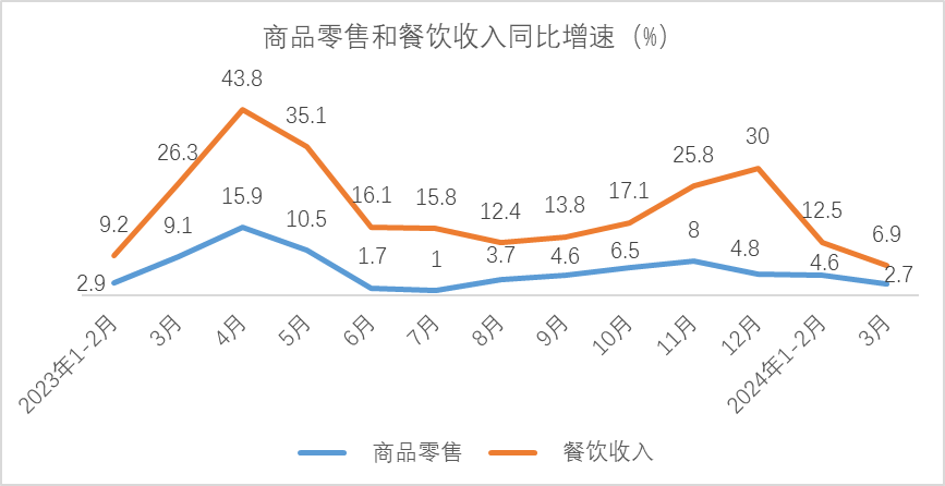 3月份,商品零售35056亿元,同比增长2.7%,增速较1-2月份放缓1.9个百分点;餐饮收入3964亿元,同比增长6.9%,增速较1-2月份放缓5.6个百分点。一季度,商品零售106882亿元,增长4.0%;餐饮收入13445亿元,增长10.8%。一季度,服务零售额同比增长10.0%,增速高于同期商品零售增速6个百分点。