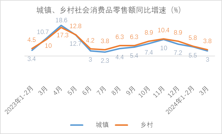 3月份,城镇消费品零售额33843亿元,同比增长3%,增速较1-2月份放缓2.5个百分点;乡村消费品零售额5177亿元,同比增长3.8%,增速较1-2月份放缓2个百分点。乡村消费品市场增速快于城镇0.8个百分点。一季度,城镇消费品零售额104280亿元,增长4.6%;乡村消费品零售额16047亿元,增长5.2%。乡村消费品市场增速快于城镇0.6个百分点。
