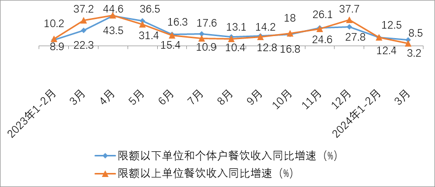 据测算,3月份,限额以下单位和个体户餐饮收入实现2790亿元,同比增长8.5%,增速较1-2月份放缓4个百分点,快于限额以上单位餐饮收入增速5.3个百分点。一季度,限额以下单位和个体户餐饮收入实现9894亿元,累计增长11.4%,快于限额以上单位餐饮收入增速2.2个百分点。