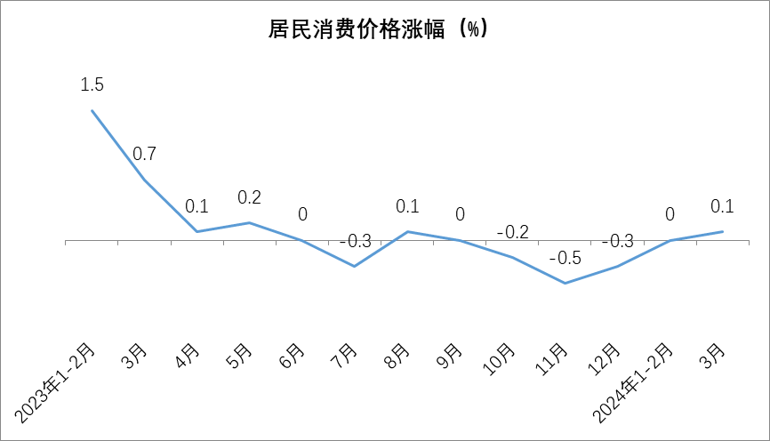 3月份,全国居民消费价格同比上涨0.1%,其中,食品价格同比下降2.7%,降幅较1-2月份收窄0.7个百分点,非食品同比上涨0.7%,涨幅与1-2月份持平;消费品价格同比下降0.4%,降幅较1-2月份收窄0.5个百分点,服务价格同比上涨0.8%,涨幅较1-2月份回落0.4个百分点。一季度,全国居民消费价格与上年同期持平。