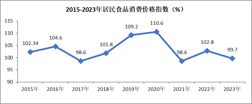 图表 2? 2015-2023年我国居民食品消费价格指数(%)