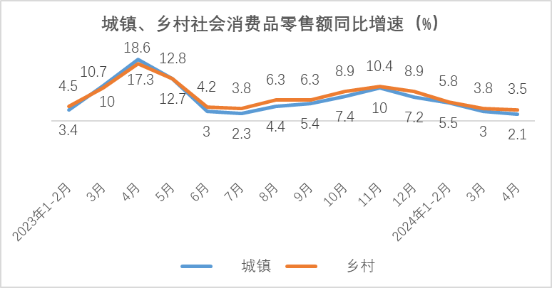 4月份,城镇消费品零售额31026亿元,同比增长2.1%,增速较3月份放缓0.9个百分点;乡村消费品零售额4673亿元,同比增长3.5%,增速较3月份放缓0.3个百分点,乡村消费品市场增速快于城镇1.4个百分点。1-4月份,城镇消费品零售额135307亿元,累计增长4%,增速较一季度放缓0.6个百分点;乡村消费品零售额20719亿元,累计增长4.8%,增速较一季度放缓0.4个百分点,乡村消费品市场增速快于城镇0.8个百分点。