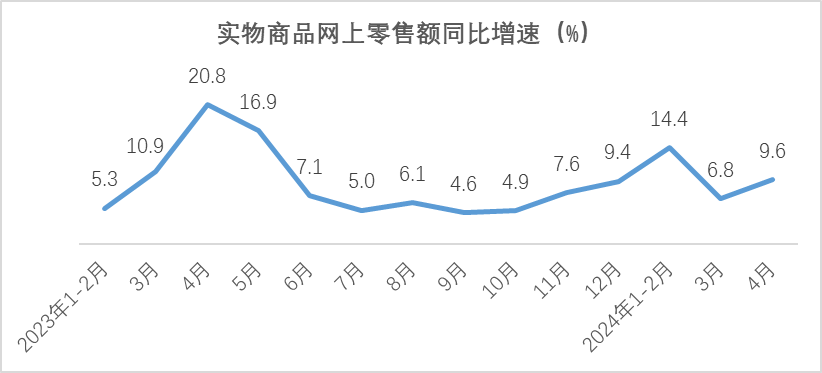 4月份,实物商品网上零售额实现9303亿元,同比增长9.6%,增速较3月份加快2.8个百分点。1-4月份,实物商品网上零售额37356亿元,累计增长11.1%,增速较一季度放缓0.5个百分点,占社会消费品零售总额的比重为23.9%,占比较一季度提高0.6个百分点。