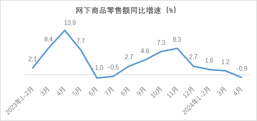 根据测算,4月份网下商品零售额同比下降0.9%,增速较3月份回落2.1个百分点。1-4月份,网下商品零售额累计增长1%,增速较一季度放缓0.5个百分点。按零售业态分,1-4月份,限额以上零售业单位中专业店、便利店、超市零售额同比分别增长5.7%、4.8%、1.8%,百货店、品牌专卖店零售额分别下降3.5%、0.6%。