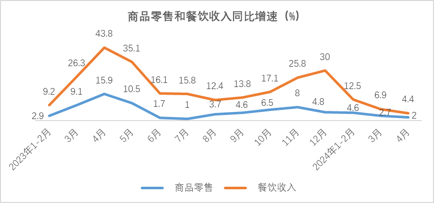 4月份,社会消费品零售总额35699亿元,同比增长2.3%,增速较3月份放缓0.8个百分点。1-4月份,社会消费品零售总额156026亿元,累计增长4.1%,增速较一季度放缓0.6个百分点。
