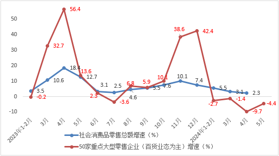 根据乐鱼电竞的监测数据,2024年5月份全国50家重点大型零售企业(以百货业态为主)零售额同比下降4.4%,降幅相比上月收窄了5.3个百分点。