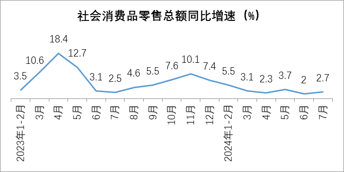 7月份,社会消费品零售总额37757亿元,同比增长2.7%,增速较6月份加快0.7个百分点。1-7月份,社会消费品零售总额273726亿元,累计增长3.5%,增速较上半年放缓0.2个百分点。