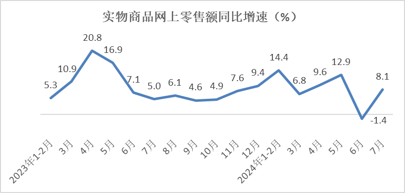 7月份,实物商品网上零售额实现10497亿元,同比增长8.1%,增速较6月份大幅提高9.5个百分点。1-7月份,实物商品网上零售额70093亿元,累计增长8.7%,增速较上半年放缓0.1个百分点,占社会消费品零售总额的比重为25.6%,占比较上半年提高0.3个百分点。‘