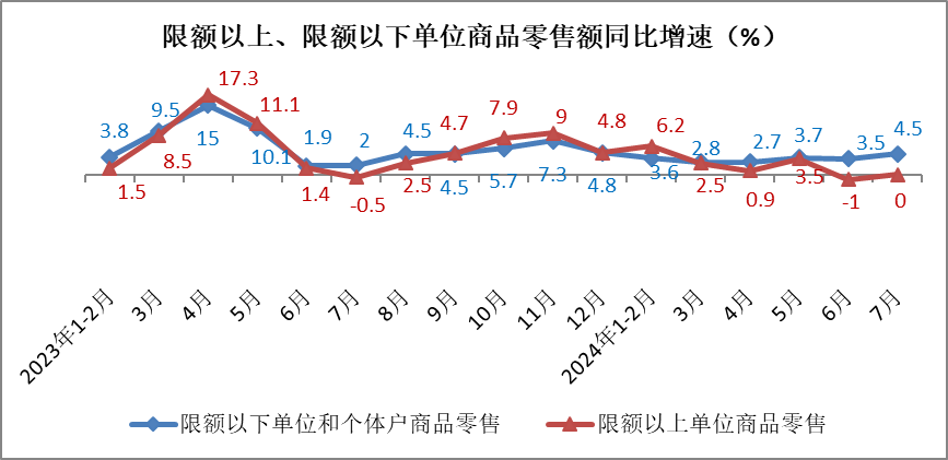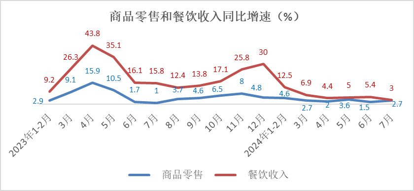 7月份,商品零售33354亿元,同比增长2.7%,增速较6月份加快1.2个百分点;餐饮收入4403亿元,同比增长3.0%,增速较6月份放缓2.4个百分点,快于商品零售增速0.3个百分点。1-7月份,商品零售243079亿元,累计增长3.1%,增速较上半年放缓0.1个百分点;餐饮收入30647亿元,累计增长7.1%,增速较上半年放缓0.8个百分点。