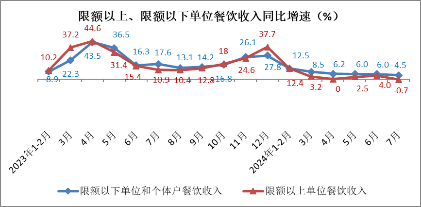 据测算,7月份,限额以下单位和个体户餐饮收入实现3186亿元,同比增长4.5%,增速较6月份放缓1.5个百分点,快于限额以上单位餐饮收入增速5.2个百分点。1-7月份,限额以下单位和个体户餐饮收入实现22229亿元,累计增长8.1%,增速快于限额以上单位餐饮收入增速3.5个百分点。