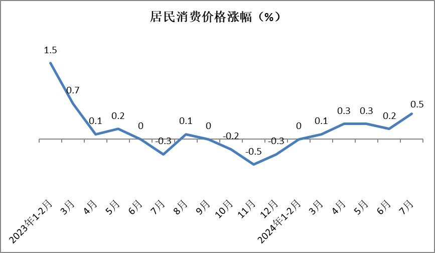 7月份,全国居民消费价格同比上涨0.5%,涨幅较6月份扩大0.3个百分点。其中,城市上涨0.5%,农村上涨0.7%;食品价格持平,非食品价格上涨0.7%;消费品价格上涨0.5%,服务价格上涨0.6%。1-7月平均,全国居民消费价格比上年同期上涨0.2%。