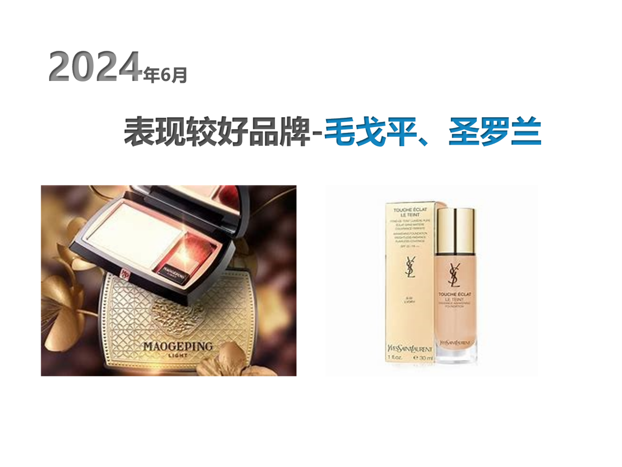 前十位品牌包括LANCOME、Dior、雅诗兰黛、圣罗兰、CHANEL、欧莱雅、毛戈平、CPB、Giorgio Armani、LAMER,6月份美容彩妆品市场前十位品牌市场综合占有率合计为48.68%,高于上年同期1.12个百分点,与上月相比则下降了1.10个百分点。
