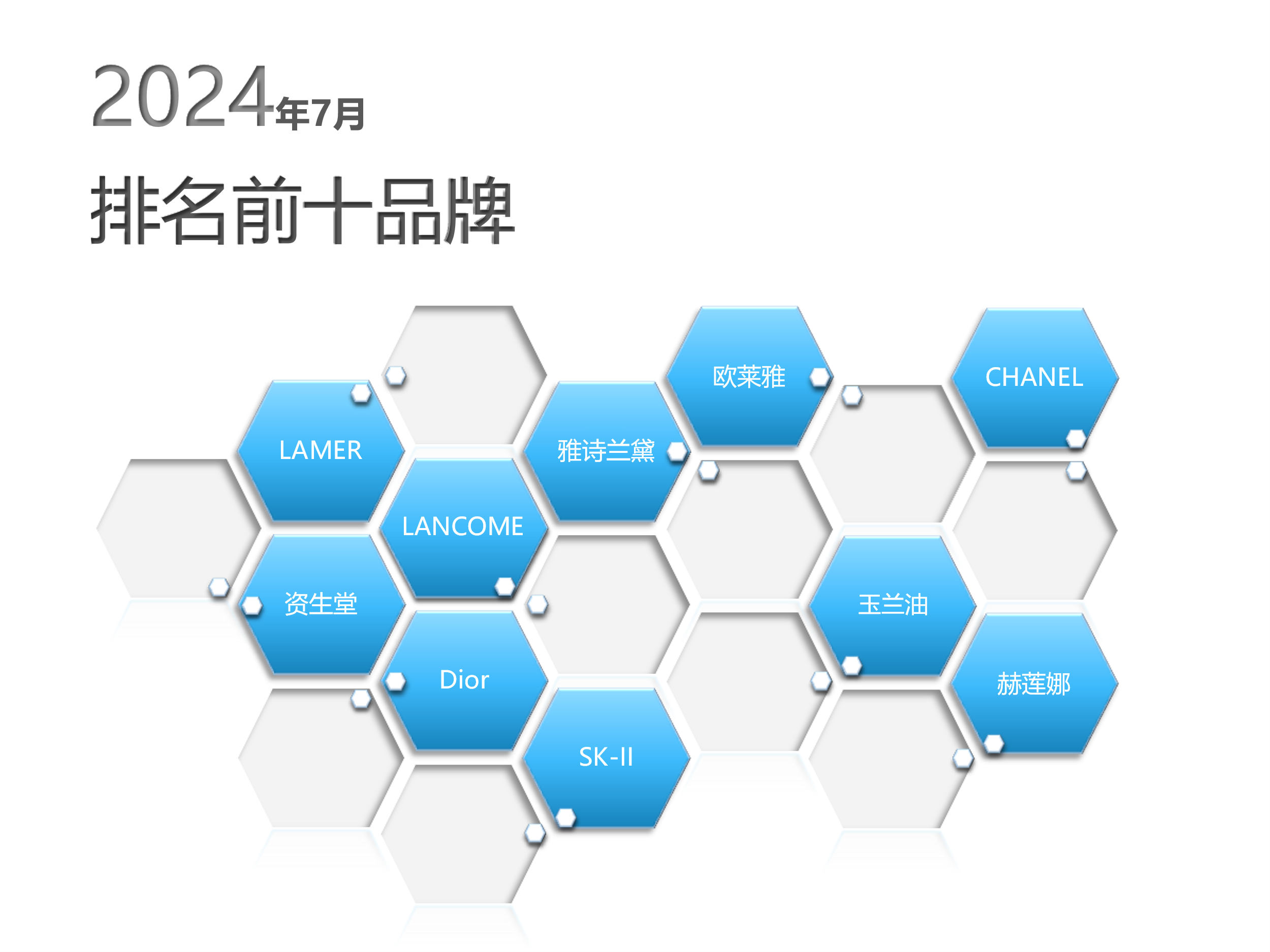 前十名品牌包括LAMER、LANCOME、雅诗兰黛、欧莱雅、CHANEL、资生堂、Dior、SK-II、玉兰油、赫莲娜,品牌集中度略有上升,前十位品牌市场品牌综合占有率合计为40.97%,较去年同期上升1.61个百分点,与上月相比上升0.32个百分点。