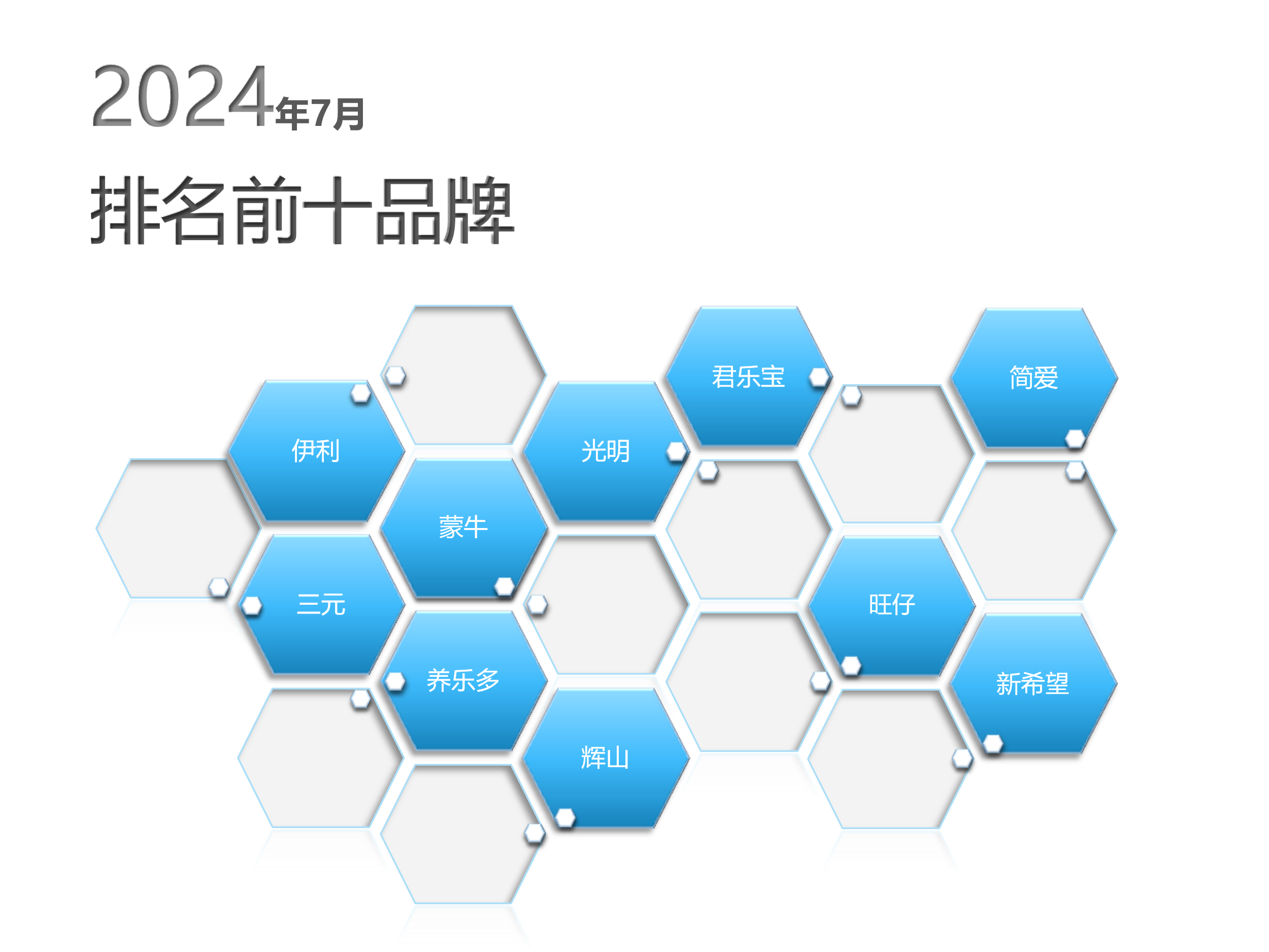 前十位品牌包括伊利、蒙牛、光明、君乐宝、简爱、三元、养乐多、辉山、旺仔和新希望,前十位品牌市场综合占有率合计为58.08%,较去年同期提高了0.14个百分点,与上月相比增长了0.53个百分点。