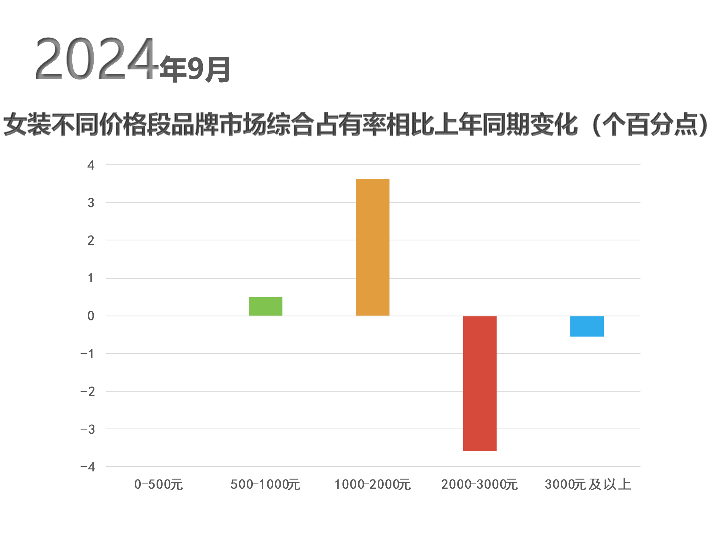 从9月份品牌数据来看,在监测范围内女装商品平均零售价格相比上月上涨明显,与去年同期相比价格基本持平。销售终端均价在1000-2000元之间的品牌市场占有率相较于上年同期提升最为明显,市场占有率上升了3.64个百分点;均价在2000-3000元区间的品牌市场占有率降幅最为显著,相较去年下降了3.59个百分点。
