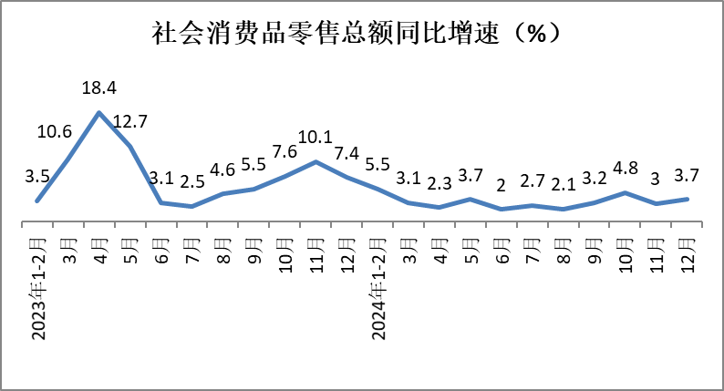 12月份,社会消费品零售总额45172亿元,同比增长3.7%,增速较11月份加快0.7个百分点。2024年,一系列扩内需促消费政策发力显效,消费品市场在新业态、新热点带动下实现平稳增长,社会消费品零售总额实现487895亿元,同比增长3.5%,增速与前11月基本持平。