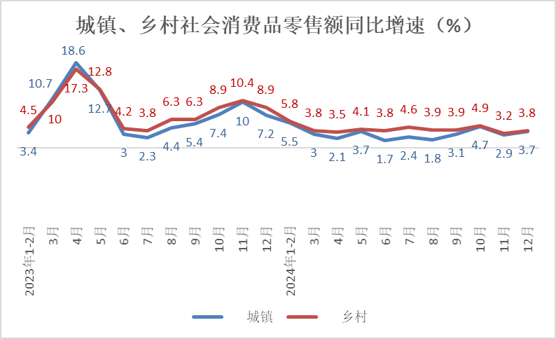 12月份,城镇、乡村消费品零售额分别为38445亿元、6727亿元,同比分别增长3.7%、3.8%,乡村市场销售增速快于城镇0.1个百分点。2024年,在乡村振兴战略持续推进、全国统一大市场加快建设的带动下,乡村消费品市场实现较快增长。城镇消费品零售额421166亿元,同比增长3.4%,增速较前11月加快0.1个百分点;乡村消费品零售额66729亿元,同比增长4.3%,增速与前11月基本持平,乡村市场销售增速快于城镇0.9个百分点。