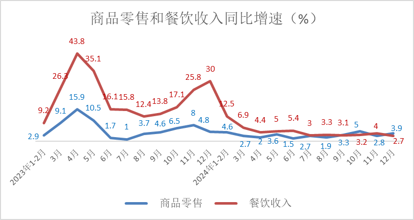12月份,商品零售39623亿元,同比增长3.9%,增速较上月加快1.1个百分点;餐饮收入5549亿元,同比增长2.7%,增速较上月放缓1.3个百分点,商品零售增速快于餐饮收入1.2个百分点。2024年,商品零售432177亿元,同比增长3.2%,增速与前11月基本持平;餐饮收入55718亿元,同比增长5.3%,增速较前11月放缓0.4个百分点。