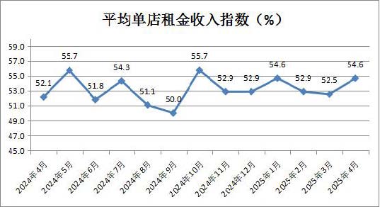 平均单店租金收入指数为54.6%,较上月上升2.1个百分点,处于中高位景气区间,表明租赁经营类企业营业收入预期向好。