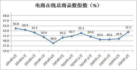 电商在线总商品数指数为52.5%,较上月上升2.7个百分点,重回扩张区间,表明本月电商经营企业备货意愿明显增强。