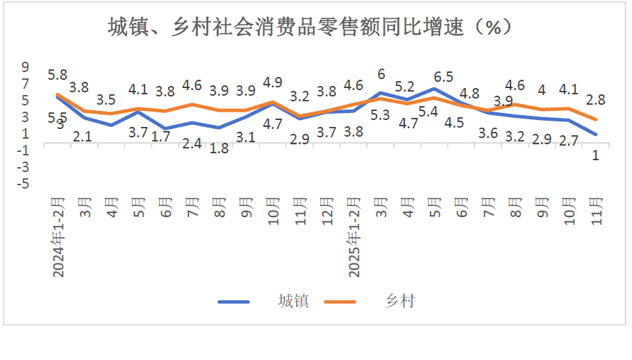 11月份,城镇消费品零售额37684亿元,同比增长1.0%,增速较10月份回落1.7个百分点;乡村消费品零售额实现6214亿元,增长2.8%,增速较10月份回落1.3个百分点,乡村市场销售增速快于城镇1.8个百分点,下半年以来持续快于城镇。