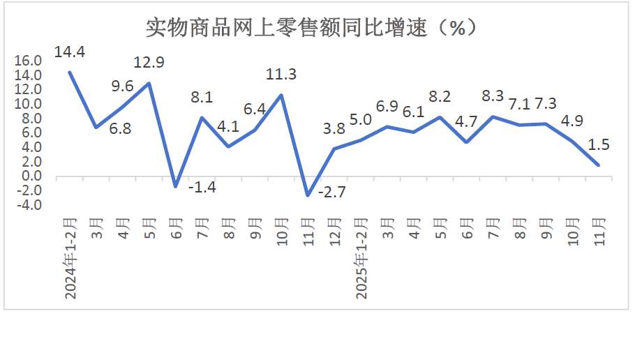11月份,实物商品网上零售额同比增长1.5%,增速较10月份回落3.4个百分点。1-11月份,实物商品网上零售额118193亿元,增长5.7%,增速较1-10月份放缓0.6个百分点,占社会消费品零售总额的比重为25.9%,占比较1-10月份提升0.7个百分点,网络零售拉动同期社会消费品零售总额增长1.5个百分点。1-11月份,在实物商品网上零售额中,吃类、穿类、用类商品分别增长14.9%、3.5%、4.4%。