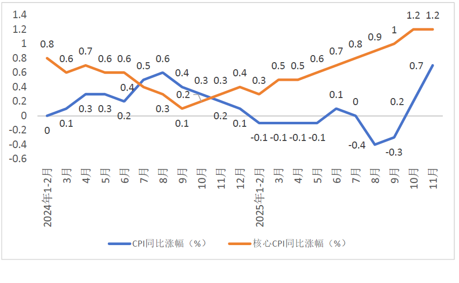 随着促进价格合理回升的各项措施逐步显效,物价形势出现积极变化,11月,居民消费价格同比上涨0.7%,涨幅比上月扩大0.5个百分点,是今年以来最高同比涨幅,主要受食品价格回升,工业消费品价格上涨和服务价格基本稳定共同拉动。扣除食品和能源后的核心CPI同比上涨1.2%,与上月持平。一是食品价格由降转涨。11月,食品价格由上月同比下降2.9%转为上涨0.2%,对CPI同比的影响由下拉0.54个百分点转为上拉0.04个百分点。其中,鲜菜、水产品、鲜果价格分别同比增长14.5%、1.5%、0.7%,分别影响CPI上涨约0.31、0.03和0.01个百分点。二是工业消费品价格回升。扩内需政策措施继续显效,11月,扣除能源的工业消费品价格同比上涨2.1%,其中,家用器具、服装价格同比分别上涨4.9%和2%。三是服务价格基本稳定。11月,受高品质生活需求扩大带动,服务价格同比上涨0.7%,其中,飞机票、家政服务和在外餐饮价格分别上涨7.0%、2.4%和1.2%。
