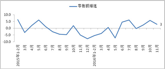 2016年11月份全国百家重点大型零售企业服装零售额同比增长3.0%