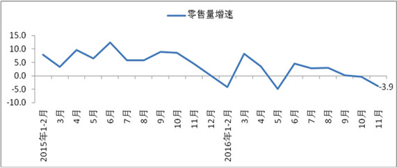 图1 2015年1月-2016年11月全国百家重点大型零售企业服装类商品零售额分月同比增速(%)