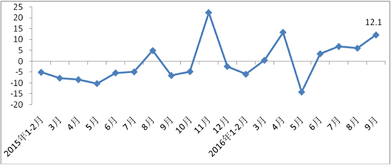 图 1 2015-2016年全国百家重点大型零售企业家电商品零售额月度增速(%)